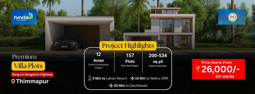 Located along the most coveted Bengaluru-Hyderabad Highway – NH44, 100m from Proposed 12 Lane Express Highway and spread across 12-acres, the Vistaara at Thimmapur near shamshabad is the project most people dream of. With major schools, hospitals and names like Procter & Gamble or the Microsoft Data Center in proximity, Pan Vistaaara at Thimmapur is a place where luxury meets comfort. What makes Vistaara truly exceptional is not just its location, but the vision behind its development. Every inch of this project has been designed with the future in mind, ensuring that residents and investors experience long-term value, sustainable appreciation, and an elevated lifestyle. The region surrounding Thimmapur is witnessing massive infrastructural upgrades, making it one of the most promising destinations in the Hyderabad growth corridor.